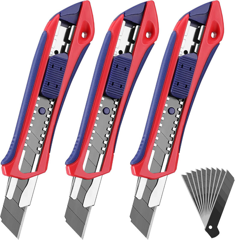 WORKPRO Set of 3 Cutter Knife Set 18 mm with 10 Replacement Blades Made of SK5, Professional Cutter Knife with Rubber Handle, Snap Off Blade, Cardboard Knife, Multi-Purpose Knife, Cutting to Paper,