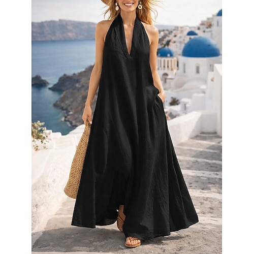 Per donna Abito lungo maxi Vestito Casual Abito a trapezio Abito in finto lino Moda Moderno Quotidiano Vacanza Uscire Vestibilità comoda Semplice Manica Lunga All'americana Blu Bianco Vino Verde