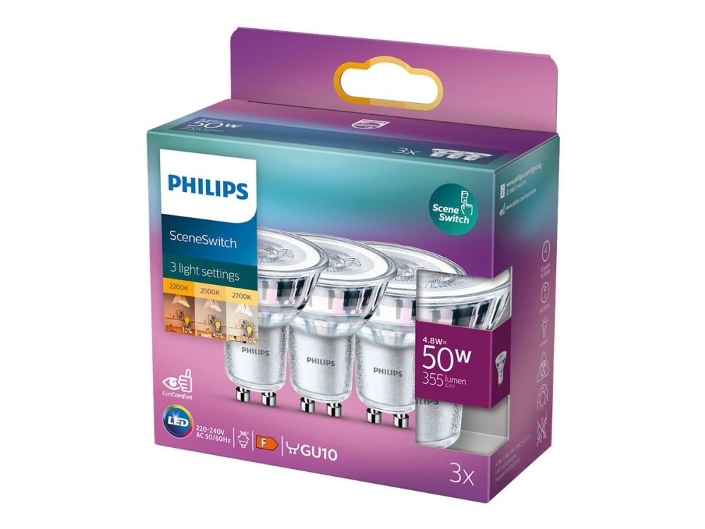 Philips SceneSwitch - LED-pære for søkelys - GU10 - 1.5/3.5/4.8 W (ekvivalent 50 W) - klasse F - varmhvitt/flammelys - 2200/2500/2700 K (en pakke 3)