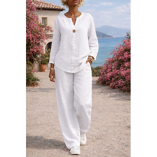 Per donna Camicia Set da due pezzi Finto cotone e lino Pantaloni di Lino Pantaloni Set Manica Lunga Scollo a V Tinta unica Coulisse Moda Streetwear Abbigliamento quotidiano Data Blu Nero Bianco
