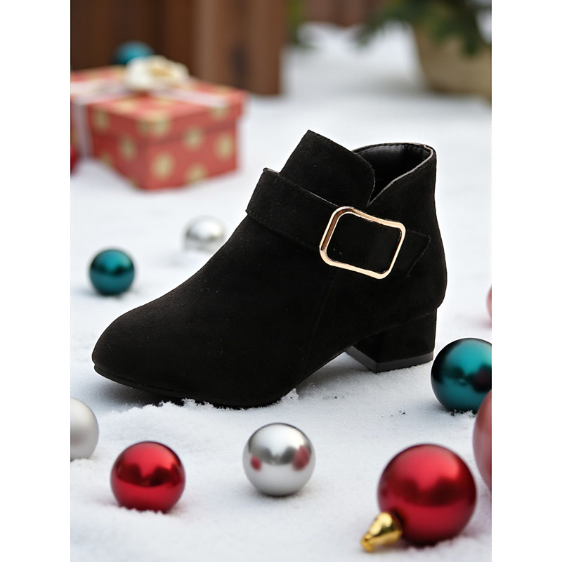 Girl's Red Suede Ankle Boots with Buckle Strap - Stylish Mid Heel Christmas Party Shoes for Kids Holiday Outfits