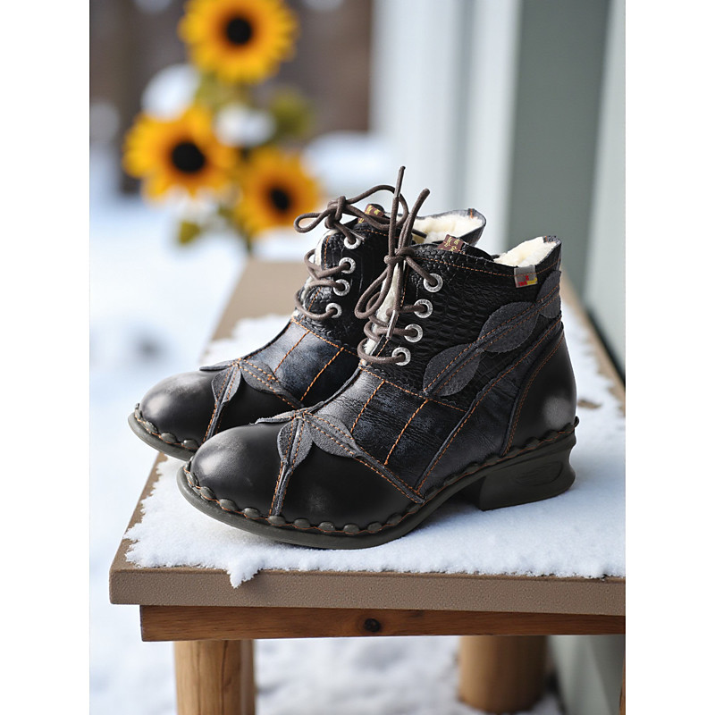 Women's Red Genuine Leather Lace-Up Ankle Boots with Unique Folded Toe Design, Warm Fleece Lining, Retro Casual Boots for Winter Outfits Outdoor Wear
