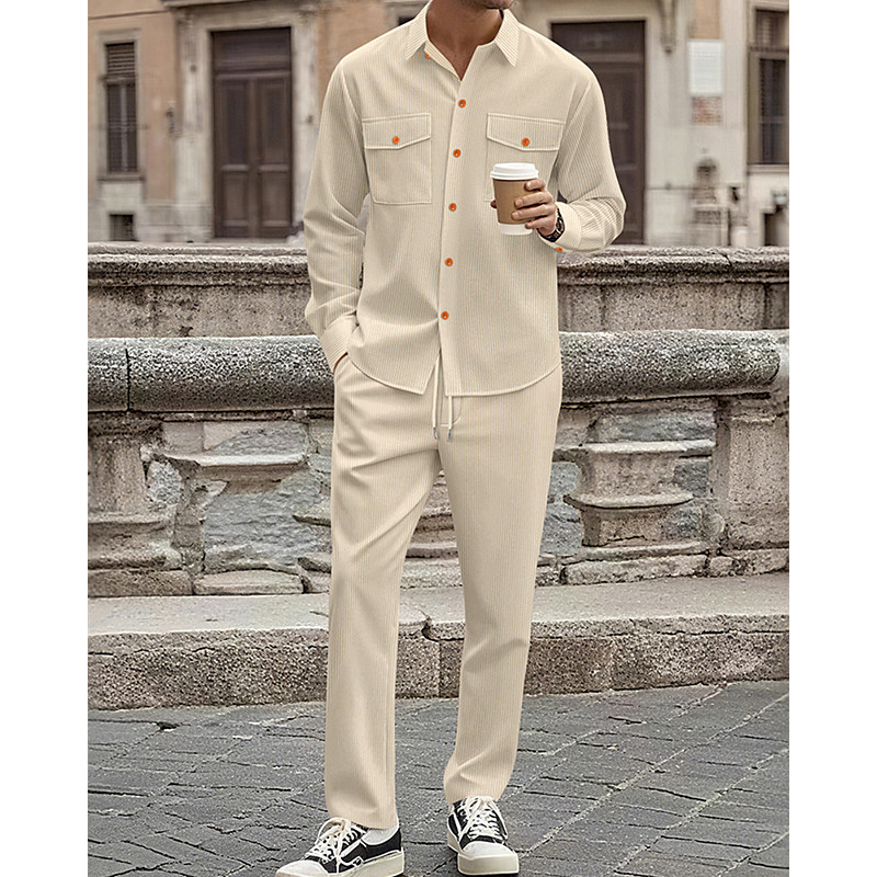 Men's Tracksuit Shirt Shirts Pants Set Lapel Outdoor Vacation Daily Drawstring Pocket Plain Black Khaki Army Green Activewear Sports Fashion Fall