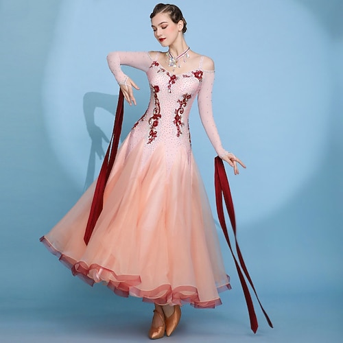 Balli da sala Abito Con diamantini Per donna Prestazioni Addestramento Manica lunga Alto Chiffon Chinlon Tulle