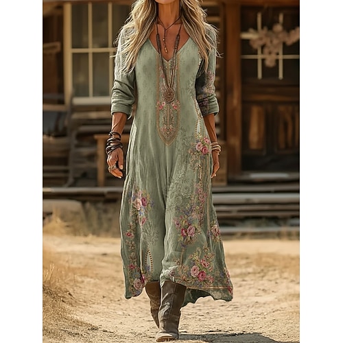 Per donna Abito lungo maxi Abito Boho Abito Vintage Vestito Casual Vintage Quotidiano All'aperto Vacanza Vestibilità comoda Floreale Manica Lunga Scollo a V Blu Verde chiaro Blu marino Verde scuro