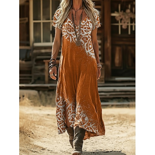 Per donna Abito lungo maxi Abito Boho Vestito Casual Abito a trapezio Abito Stampato Vintage All'aperto Vacanza Weekend Vestibilità comoda Grafico Manica Corta Scollo a V Nero Giallo Verde chiaro Rosa