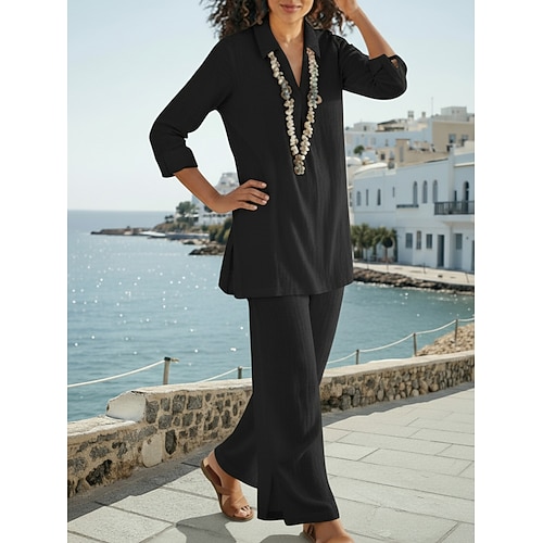 Per donna Misto cotone Set di Pantaloni Manica Lunga Colletto a Camicia Semplice Spacco sulla Coscia Moda Streetwear Casuale Quotidiano All'aperto Nero Blu marino Cammello Primavera Vestibilità comoda