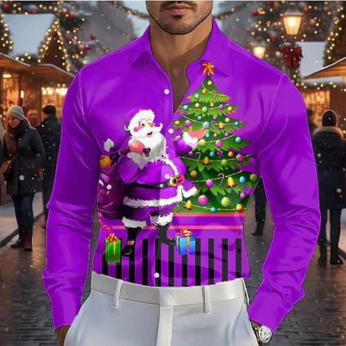 Weihnachten Herren Weihnachtsmann Weihnachtsbaum lustige weihnachten Hemd Satinhemd Kleidhemd Langarm Modisch lässig Outdoor Ferien Frühling Herbst Umlegekragen 3D-Druck Hemden mit Knopfleiste Rote