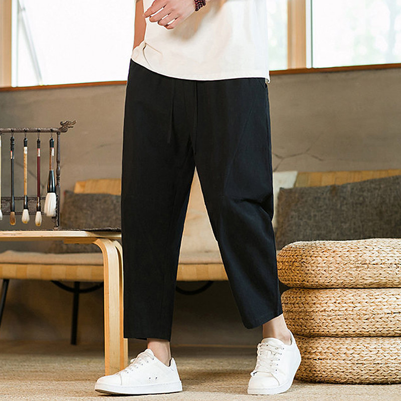 Men's Linen Pants Trousers Summer Pants Harem Pants Pocket Drawstring Elastic Waist Plain Comfort Breathable Ankle-Length Home Casual Daily Fashion Classic Style Black Navy Blue