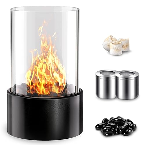 braciere da tavolo con pietre di vetro, piccolo camino rotondo da patio con ciotola e tappetino, decorazione portatile per la casa, fiamma di lunga durata, 2 camere di combustione sostituibili
