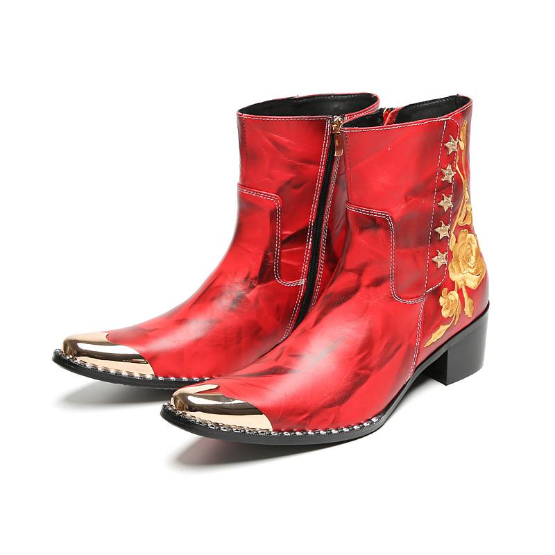 Men's Genuine Cowhide Leather Red Zip-Up Ankle Boots with Gold Floral Detail – Stylish Western Punk Boots for Festivals and Performances
