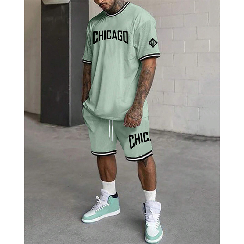 Men's Tracksuit Outfit Set Shorts Crew Neck Outdoor Daily Sports Pocket Drawstring 2 Piece Graphic Letter Black White Light Green Polyester Activewear Streetwear Casual Summer