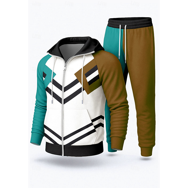 Men's Hoodie Tracksuit 2 Piece Tracksuit Drawstring Zip Up Geometric Clothing Suit Fall Light Brown Rust Red Vocation Outdoor Travel Lightweight Fashion Long Sleeve Sport Activewear Stretchy Regular