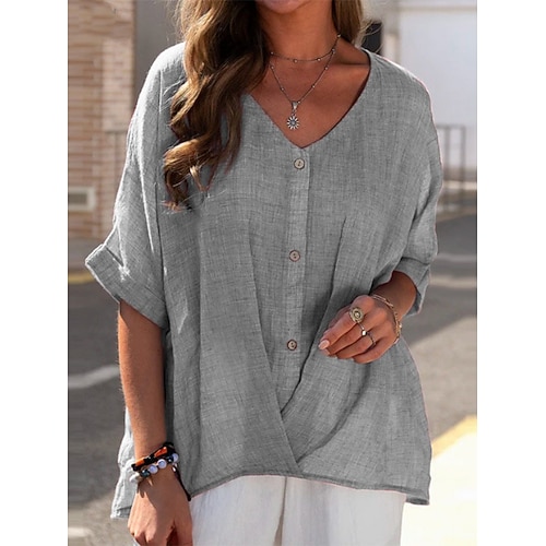 Per donna Camicia Tinta unica Elegante Casual Manica 3/4 Scollo a V Top Regolari Quotidiano Bottoni Rosa Viola Verde Cachi Grigio Estate Primavera