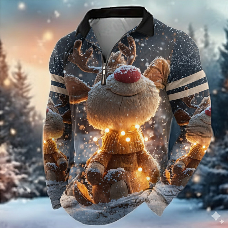Christmas Men's Cartoon Elk Polo Long Sleeve Turndown Modern Casual Casual Daily Festival Zipper 3D Print Spring Fall Winter Black Red Green