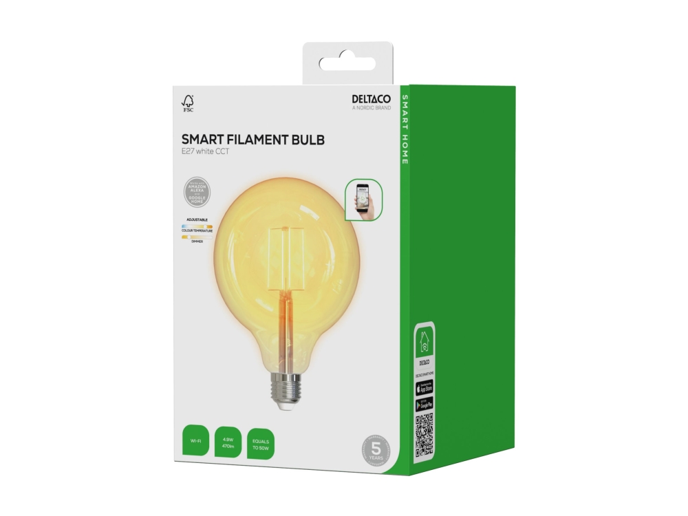 Deltaco SH-LFE27G125, Älylamppu, Läpinäkyvä, Wi-Fi, LED, 1800 K, 6500 K
