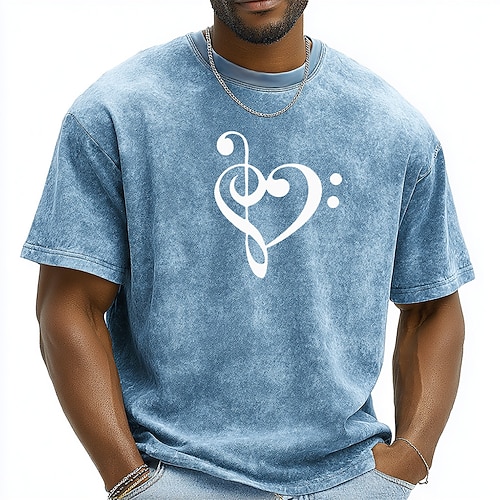 Maglietta da uomo con grafica a tema musicale: cuore, chiave di violino, chiave di basso, simbolo retrò vintage, lavaggio acido, vestibilità comoda, streetwear casual, regalo per musicisti,