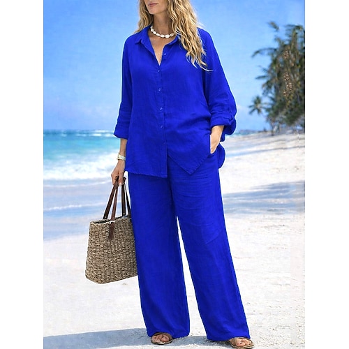Per donna Set di Pantaloni Bolero Finto cotone e lino Manica Lunga Colletto a Camicia Tinta unica Moda Streetwear Casuale Quotidiano All'aperto Blu Nero Bianco Estate Vestibilità comoda