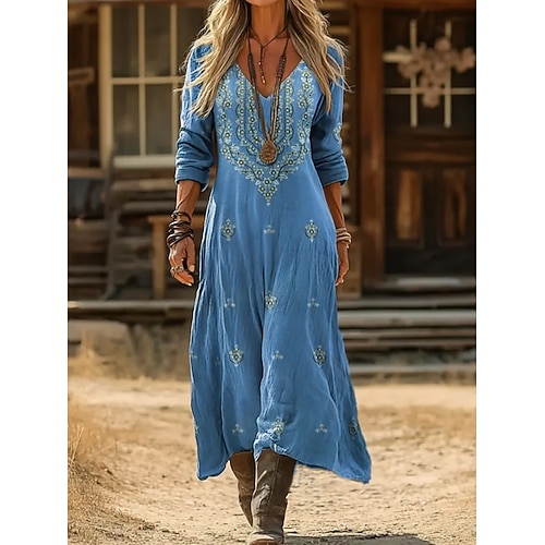 Per donna Abito maxi Vestito Estivo Abito a trapezio Vacanza Casual Boho Spiaggia Feste Vestibilità comoda Floreale Grafico Geometrico Manica Lunga Scollo a V Blu bianco Nero Cachi Estate Primavera