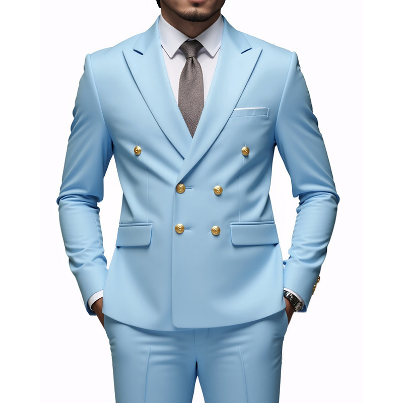 Men's Wedding Party Suits V Neck Light Blue Black Solid Colored Tailored Fit 3 Piece Double Breasted Six-buttons