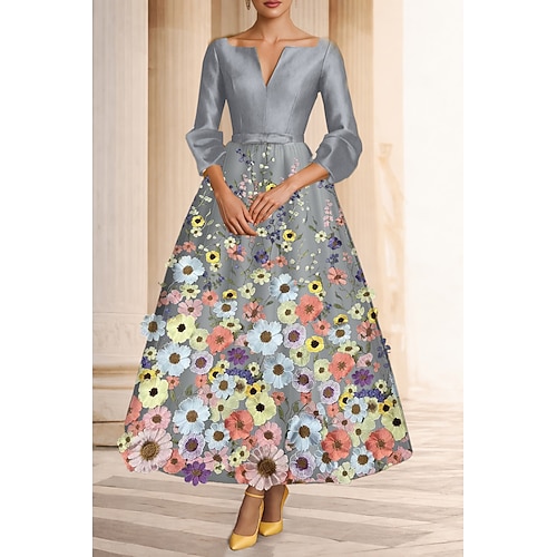 Linea ad A Lunghezza alla caviglia Vestito da Festa Abito da Cocktail Abito da invitata a nozze Abito da cerimonia per signora Manica 3/4 Collo gioiello Elegante Floreale Madre Formale Derby del