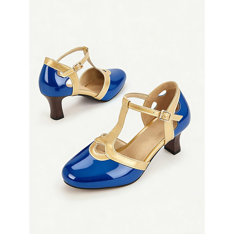 Women's Classic T-Strap Retro Heels – Elegant Vintage Style Mary Jane Pumps with Gold Trim and Block Heel for 1920s Parties and Formal Occasions