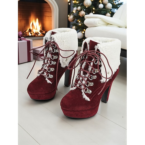 Rote High Heel Stiefel mit Kunstfellfutter für Damen – stylische Plateaustiefel mit Schnürung für den Winter, Weihnachtsfeiern festliche Anlässe