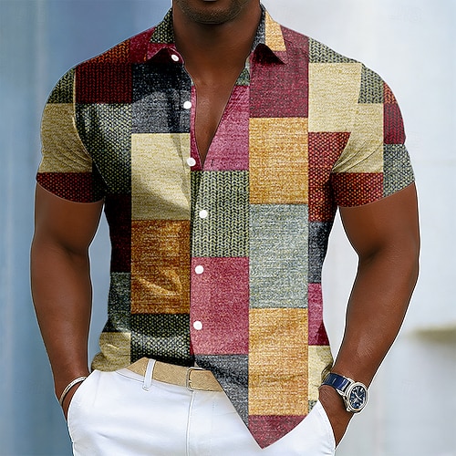 Herren Geometrisch Farbblock Patchwork Hemd Knopfhemd Kurzarm Modisch lässig Täglich Outdoor Urlaub Sommer Frühling Umlegekragen 3D-Druck Leinenähnliches Hemd Blau Rote