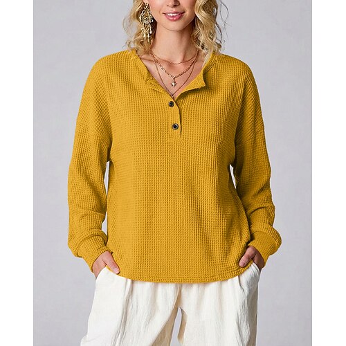 Per donna Camicia Top a maglia waffle Tinta unica Elegante Classico Casual Manica Lunga Henley Top Regolari Quotidiano Sportivo Weekend Nero Bianco Giallo Rosso Arancione Estate Primavera Autunno