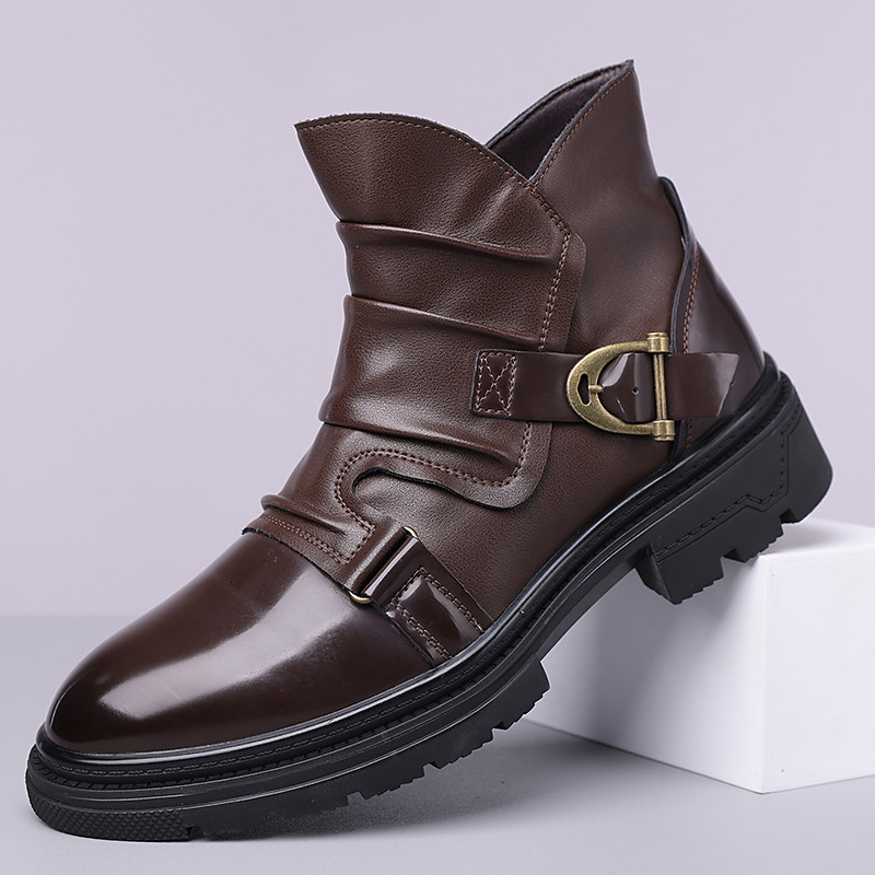 Men's Brown Faux Leather Strap Boots – Trendy Design with Buckle Detailing, Perfect for Casual Outings, Winter Fashion and Outdoor Wear