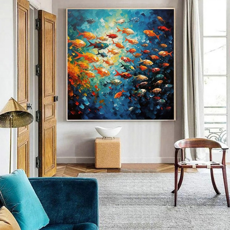 Handmade Oil Painting Canvas Wall Art Decoration Modern Abstract Marine Fish Landscape for Home Living Room Decor Rolled Frameless Unstretched Painting
