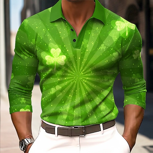 San Patrizio Per uomo Quadrifoglio Polo con zip Manica Lunga Magliette polo Camicie con Colletto Casual All'aperto Streetwear Athleisure Abito da festa Stampa 3D Primavera Autunno Nero Verde Blu
