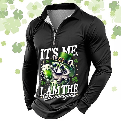 San Patrizio Per uomo Testo Polo con zip Manica Lunga Magliette polo Bavero Casual All'aperto Abito da festa Stampa 3D Primavera Autunno Nero Blu marino Verde