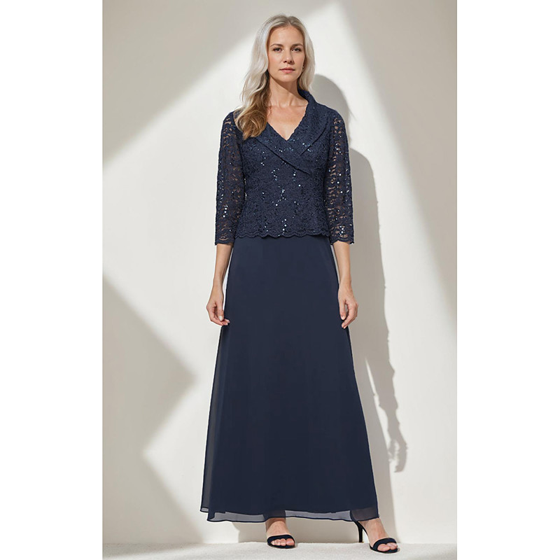 A-Line Floor Length Party Dress Cocktail Dress Wedding Guest Dress Mother of the Bride Dress 3/4 Length Sleeve V Neck Elegant Simple Minimalist Formal Wedding Guest Chiffon Lace with Lace Sequin