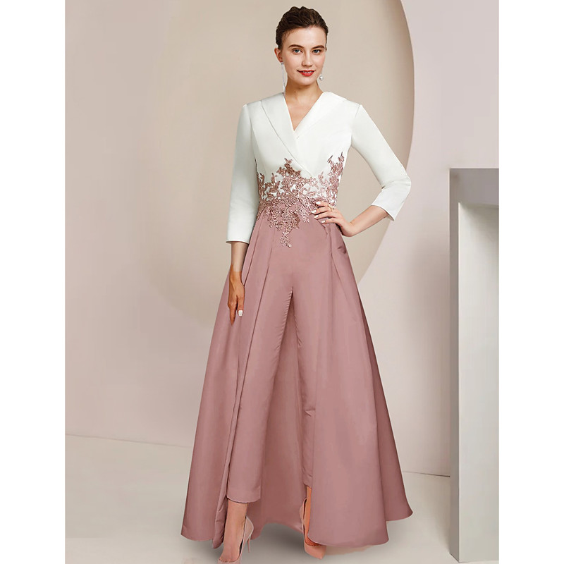 Two Piece Jumpsuit Pantsuit Ankle Length Mother of the Bride Dress 3/4 Length Sleeve V Neck Elegant Party Formal Wedding Guest Crepe Lace with Appliques Color Block