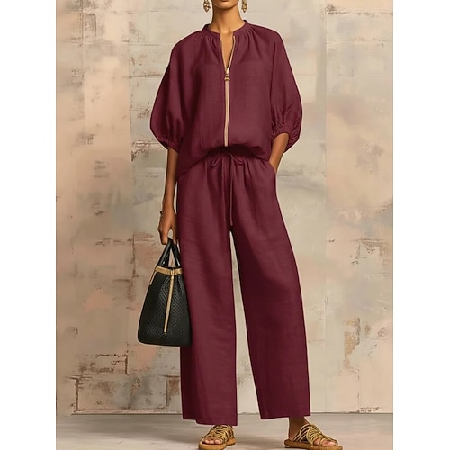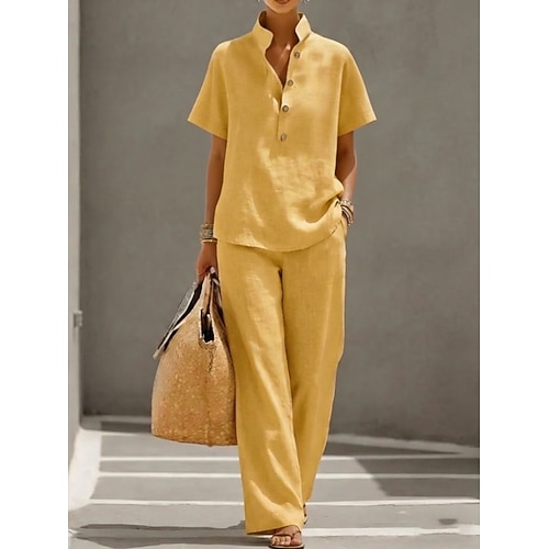 Per donna Set di Pantaloni Finto cotone e lino Manica Corta Collo alla coreana Tinta unica Moda Streetwear Casuale Quotidiano All'aperto Blu Giallo Verde Primavera Estate Vestibilità comoda