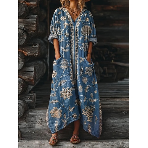Per donna Abito maxi Abito Boho Vestito Casual Abito Stampato Vintage All'aperto Vacanza Weekend Vestibilità comoda Floreale Grafico Manica Lunga Scollo a V Blu Vino Viola Verde Estate Primavera