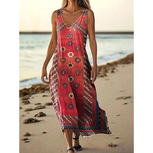 Per donna Mini Abito Abito a trapezio Abito Sottoveste Abito a spalle scoperte Vacanza Casual Spiaggia Uscire Vestibilità comoda Grafico Geometrico Senza Maniche Scollo a V Rosso Estate Primavera