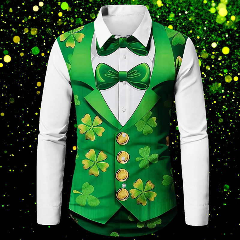 St. Patrick Men's Four Leaf Clover Shirt Long Sleeve Abstract Party St.Patrick's Day Spring Fall Turndown Button Up White Yellow