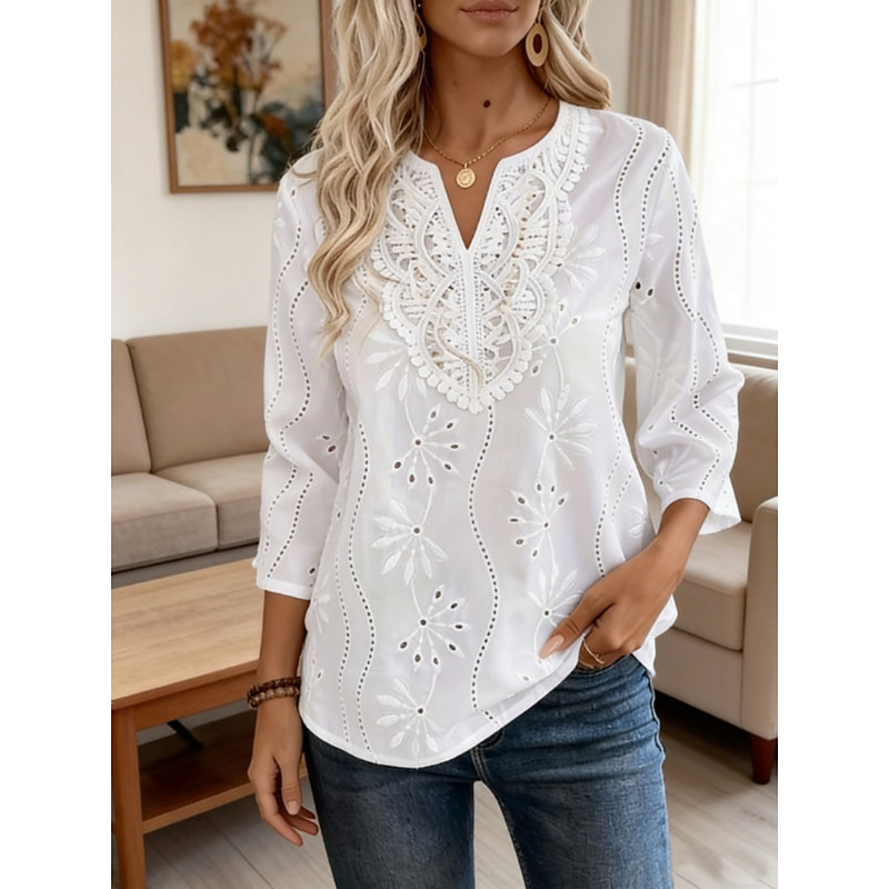 Women's Blouse Solid Color Stylish Casual 3/4 Length Sleeve V Neck Regular Tops Daily Eyelet Black White Summer Spring Fall