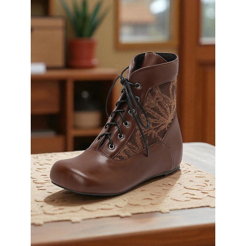 Women's Brown Faux Leather Fabric Hidden Wedge Lace-Up Ankle Boots, 1950s Vintage Shoes for Retro Outfits, Cosplay Daily Wear