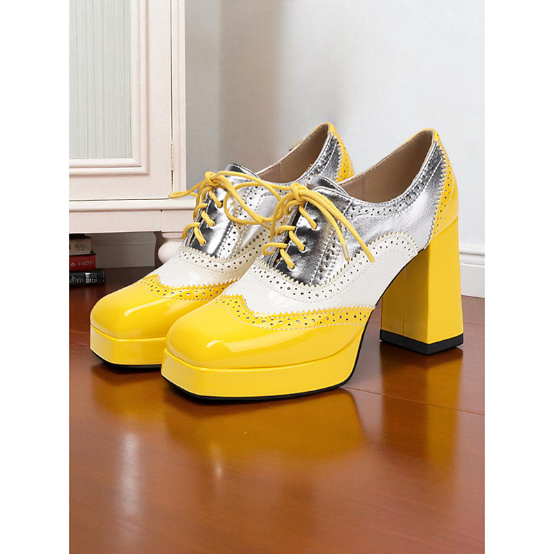 Women's Colorblock Oxford Platform Heels – Retro Patent Leather Lace-Up Brogue Shoes for Statement Looks and Costumes