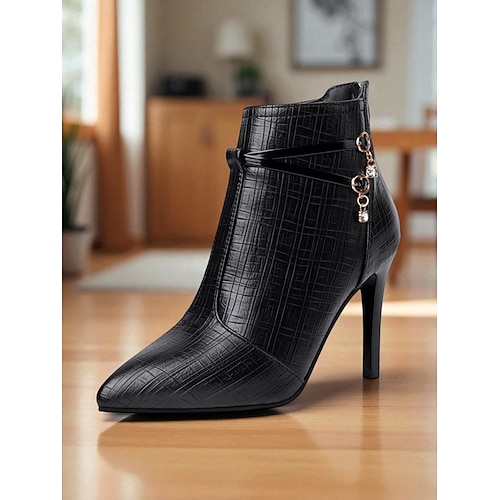 Schwarze High Heel-Stiefeletten mit Krokodilmuster für Damen – spitze Stiletto-Stiefeletten aus Kunstleder mit dekorativen Riemen und Strass-Anhängern für elegante Herbst-Winter-Outfits, Büro und