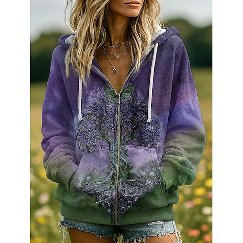 Felpa con cappuccio vintage boho 3D stampata per donna felpa patchwork felpa con cappuccio floreale chiusura lampo casual cappuccio abbigliamento quotidiano da strada patchwork tasca con zip viola