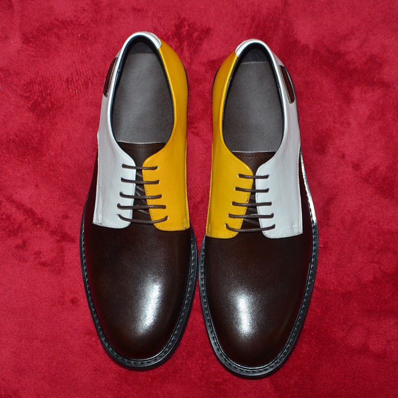 Men's Mardi Gras Brown, Orange, and Yellow Colorblock Leather Dress Shoes, Trendy and Stylish Formal Footwear for Carnival and Parties