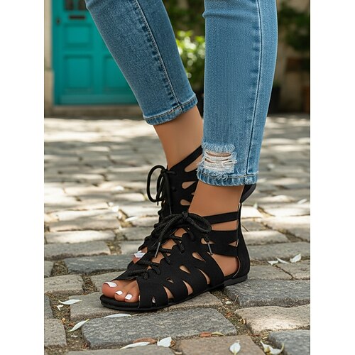 Dunkelbraune Gladiator-Sandalen mit Schnürung und Cut-outs für Damen – trendige, lässige flache Schuhe für Spaziergänge in der Stadt und sommerliche Alltagsaktivitäten