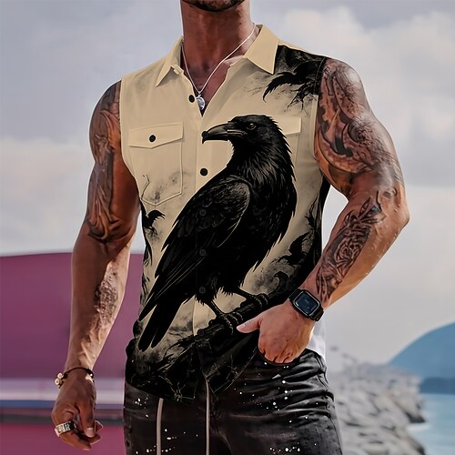 Herren Vogel Krähe Raven Hemd Knopfhemd Ärmelloses Shirt Ärmellos Dunkler Gothic-Stil Outdoor Lässig Sommer Frühling Umlegekragen 3D-Druck Zwei Fronttaschen Blau Weiß Khaki Grau
