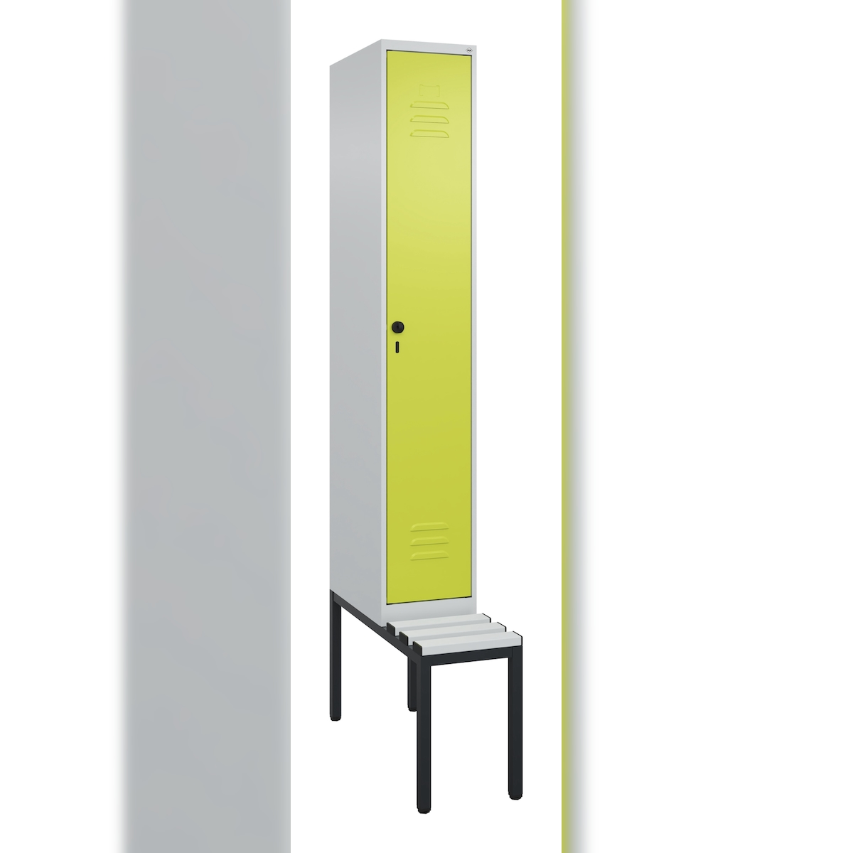 C+P Spind Classic PLUS, Kunststoff untergebaute Sitzbank, 1 Abteil, HxBxT 212x30x82cm, Sicherheitsdrehriegel, Hellgrau/Clowngrün von PROREGAL