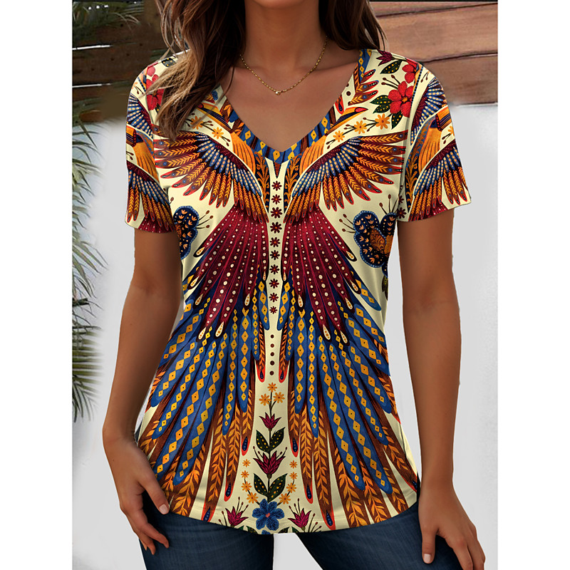 Women's T Shirt Graphic Geometric Paisley Bohemia Vintage Stylish Short Sleeve V Neck Regular Tops Daily Going out Beach Wear Print BlackWhiteRed Black White Red Purple Summer