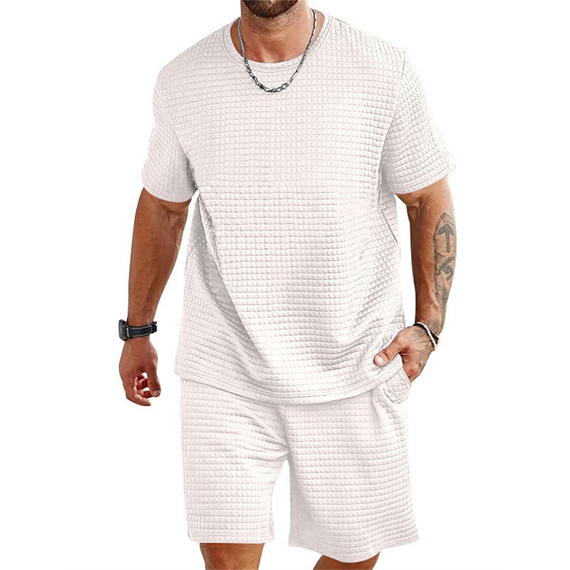 Men's Waffle Tracksuit T shirt Shorts Set Outfit Set Crew Neck Outdoor Daily Sports Pocket Drawstring 2 Piece Plain Black White Khaki Polyester Activewear Classic Casual Summer